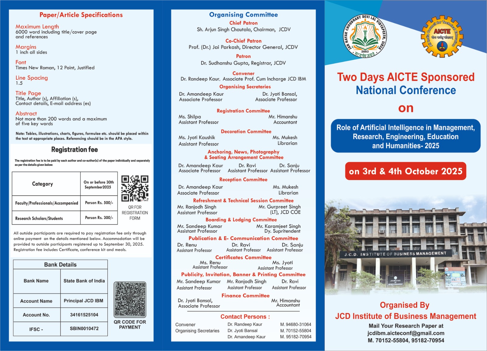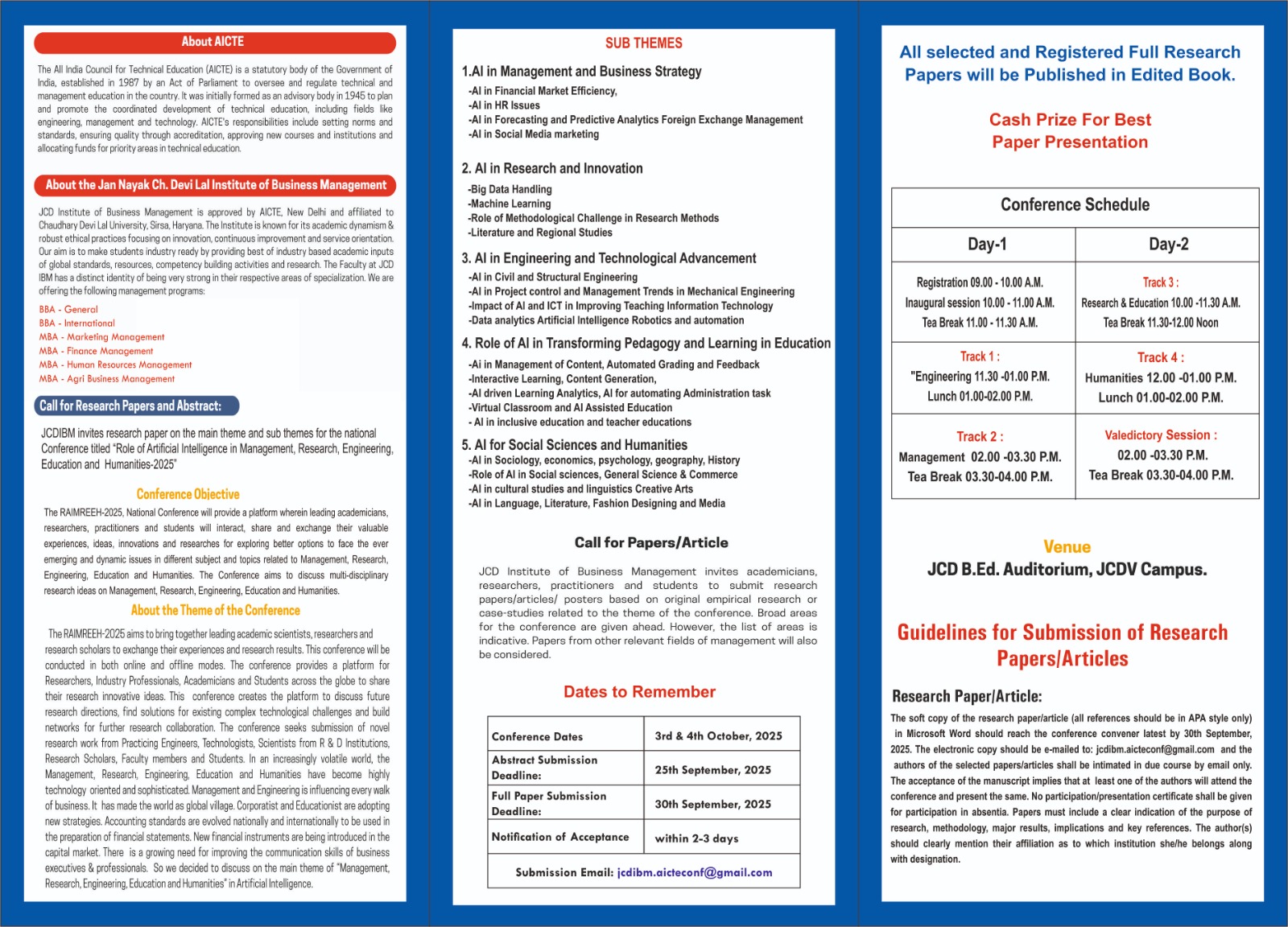 We are delighted to announce that our institute is organizing an “AICTE Sponsored Two Days National Conference” on 3rd & 4th October, 2025 at our campus in JCD Vidyapeeth, Sirsa. This conference aims to bring together academicians, research scholars, industry professionals and students to share their insights, research findings and innovative ideas on “Role of Artificial Intelligence in Management, Research, Engineering, Education and Humanities – 2025.”