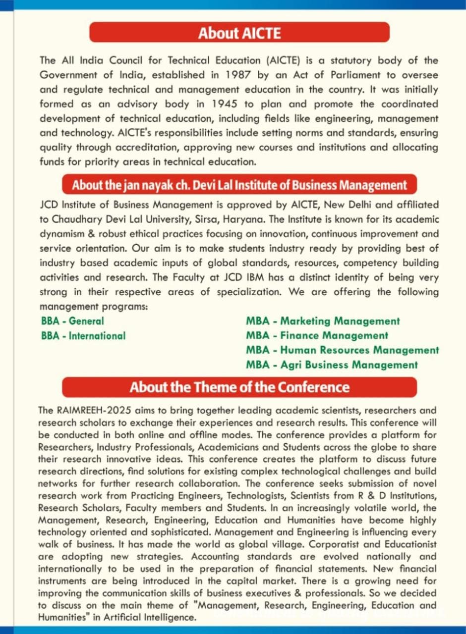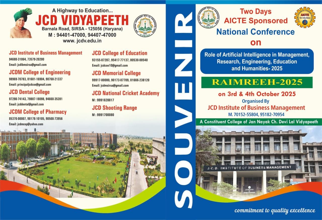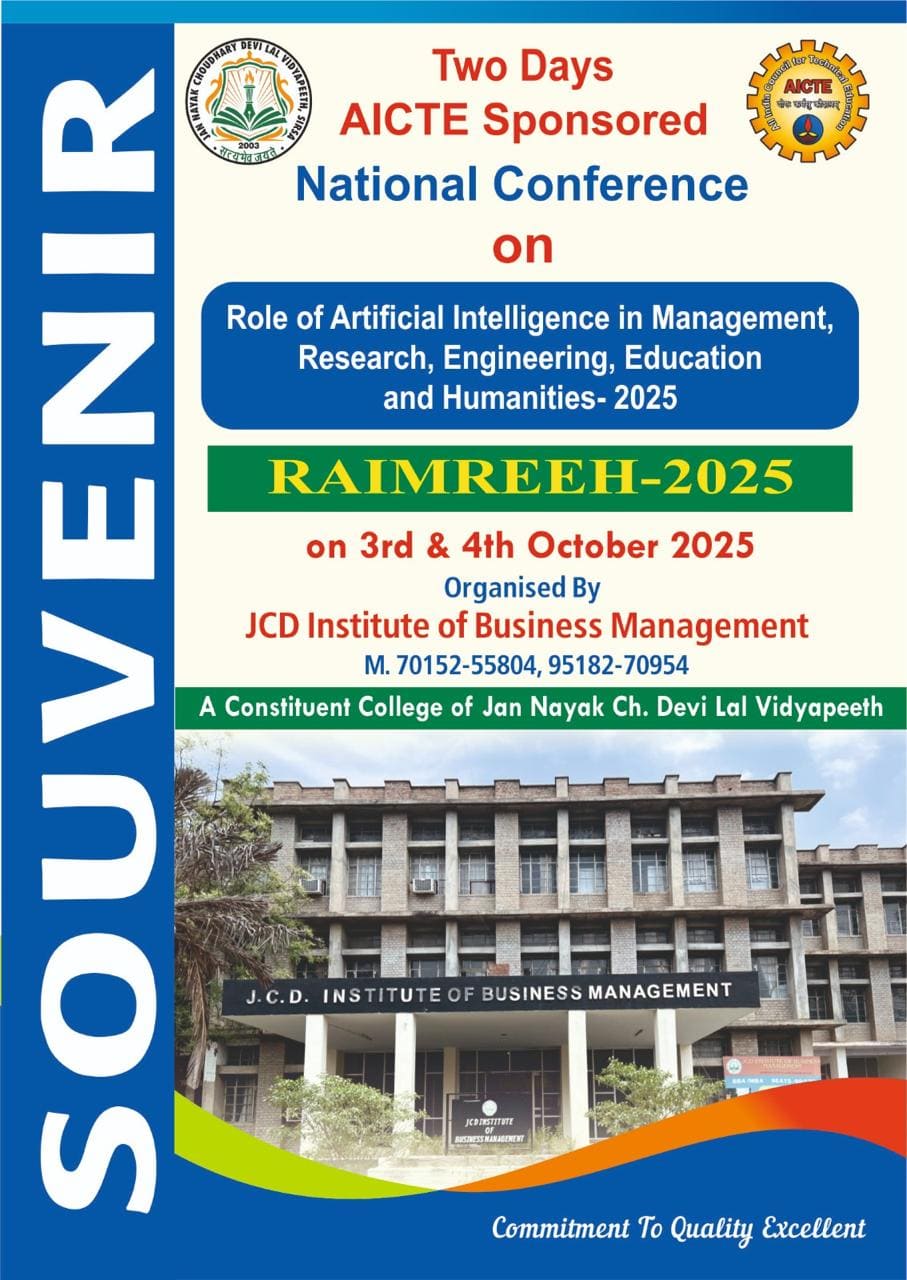 Two-Day AICTE Sponsored National Conference (RAIMREEH–2025) The All India Council for Technical Education sponsored Two-Day National Conference on “Role of Artificial Intelligence in Management, Research, Engineering, Education and Humanities (RAIMREEH–2025)” was successfully organized on 3rd and 4th October 2025 by the JCD Institute of Business Management, a constituent college of Jan Nayak Chaudhary Devi Lal Vidyapeeth. About the Conference.