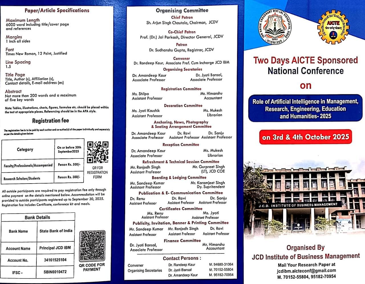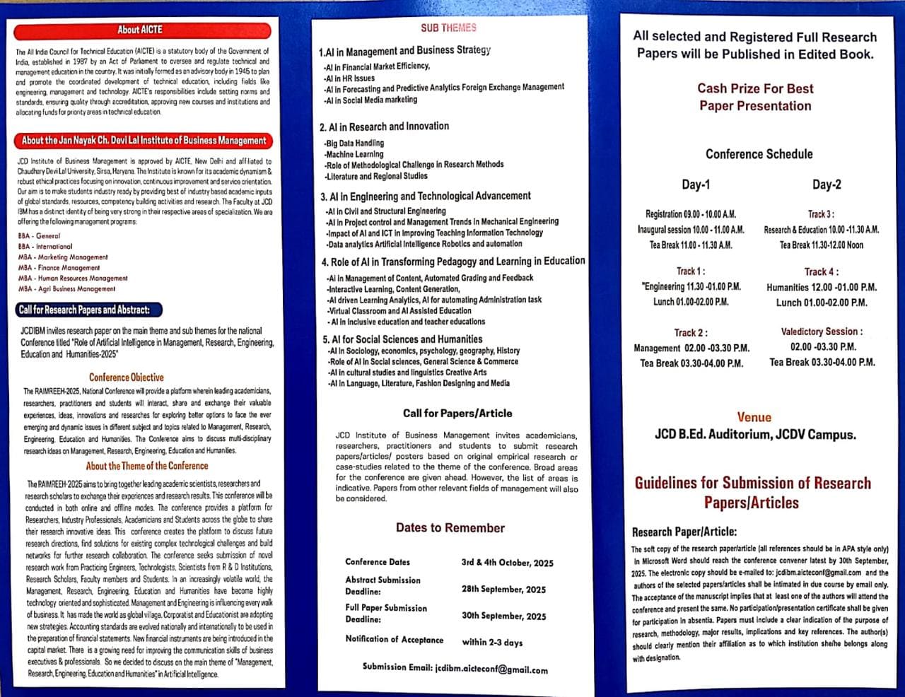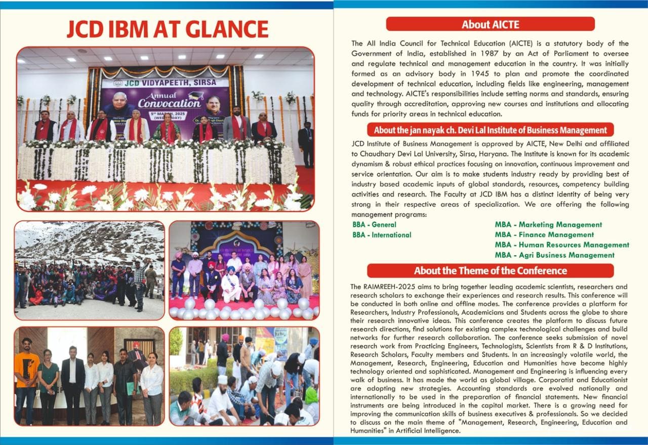 Two-Day AICTE Sponsored National Conference (RAIMREEH–2025) The All India Council for Technical Education sponsored Two-Day National Conference on “Role of Artificial Intelligence in Management, Research, Engineering, Education and Humanities (RAIMREEH–2025)” was successfully organized on 3rd and 4th October 2025 by the JCD Institute of Business Management, a constituent college of Jan Nayak Chaudhary Devi Lal Vidyapeeth. About the Conference.